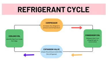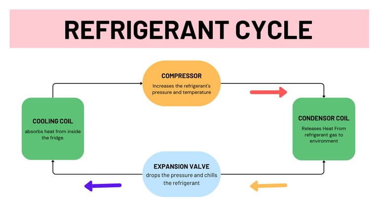 Refrigerators use the concept of thermodynamic energy transfer. They are not actually generating coolness; instead, they remove heat (thermal energy) from within the appliance and release it into the external environment. The process begins when heat (thermal energy) is absorbed from the food compartment by a refrigerant fluid circulating within the coils. A compressor then compresses the refrigerant to increase its pressure and thereby increase its temperature above the outside temperature. The refrigerant is then circulated through coils on the back of the refrigerator, where the heat is released to the outside air. This is the reason for the warmth in the back of your refrigerator. Finally, an expansion valve decompresses the refrigerant, making it cool and ready to absorb heat again.